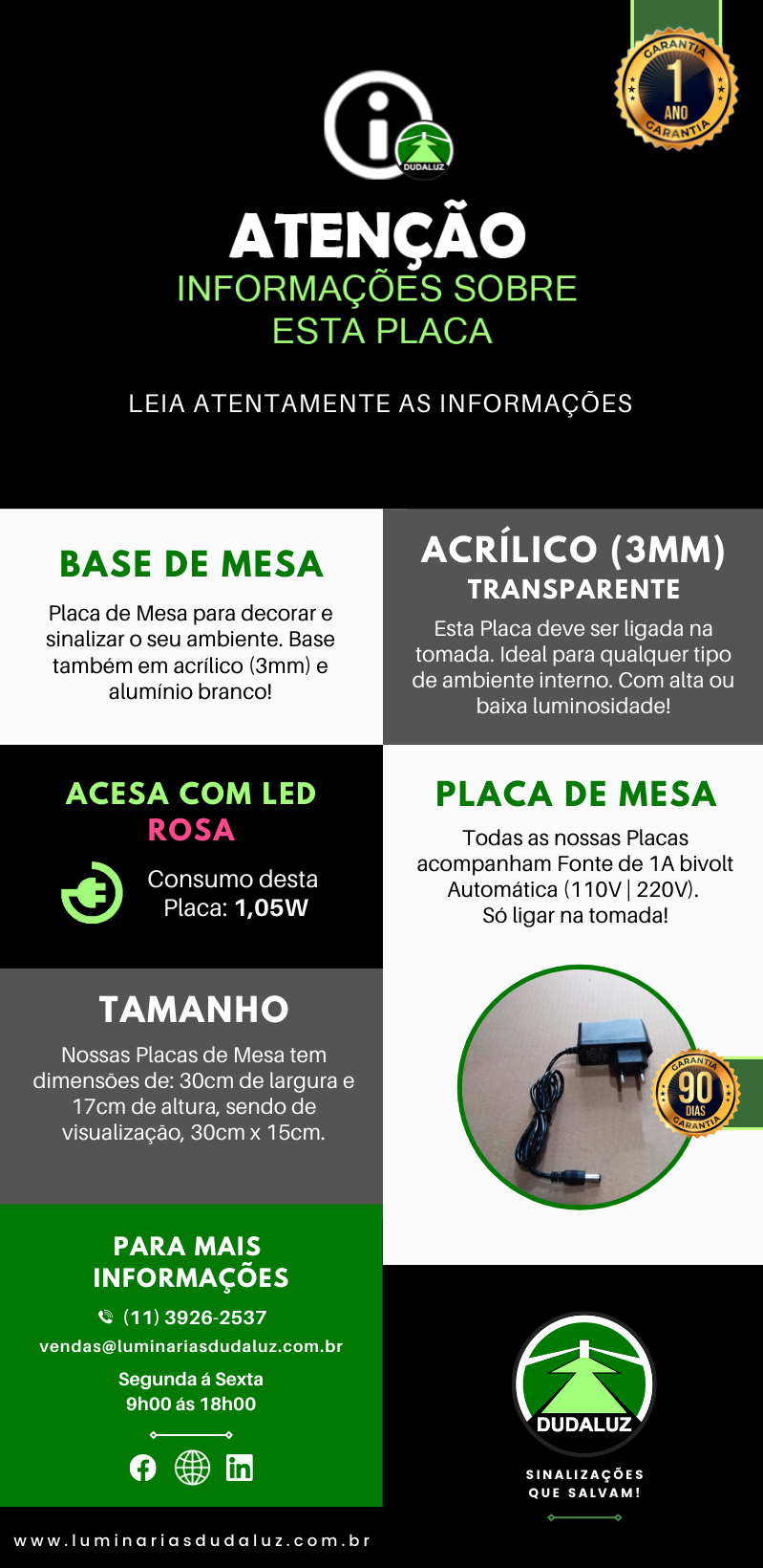 Garantia: 1 ano para defeito de fabricação da Placa | somente uso interno | 90 dias de garantia para a Fonte.  |
